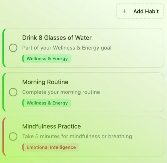Growthrarium offers a collection of ready-made wellness habits designed to help you regain energy and balance without overthinking what to do. These suggested habits include mindful breathing, hydration breaks, gentle movement, gratitude moments, emotional check-ins, and evening wind-down rituals.